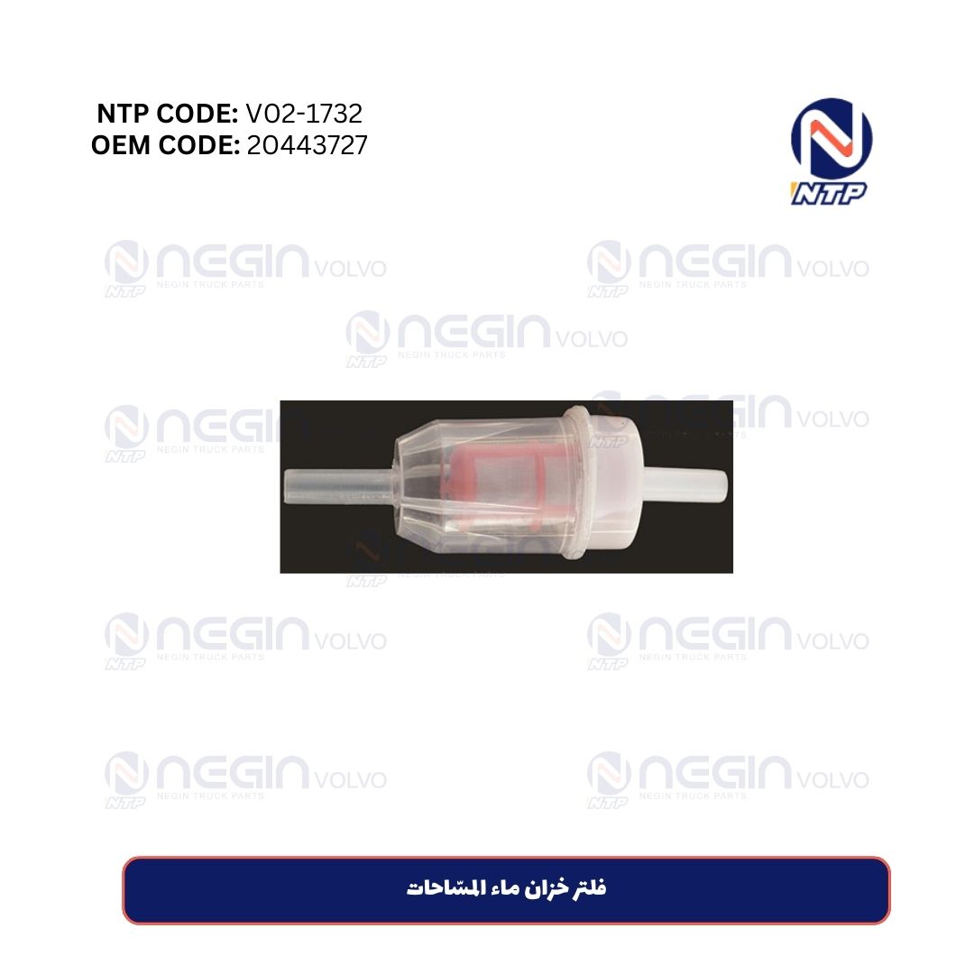 فلتر خزان ماء المسّاحات | رقم القطعة: 20443727 يمنع دخول الشوائب والرواسب إلى مضخة ماء المسّاحات وفوهات الرش. يُستخدم هذا الفلتر لتحسين أداء نظام تنظيف الزجاج الأمامي وزيادة عمر المضخة، خصوصًا في الشاحنات الثقيلة مثل فولفو FH وFM.